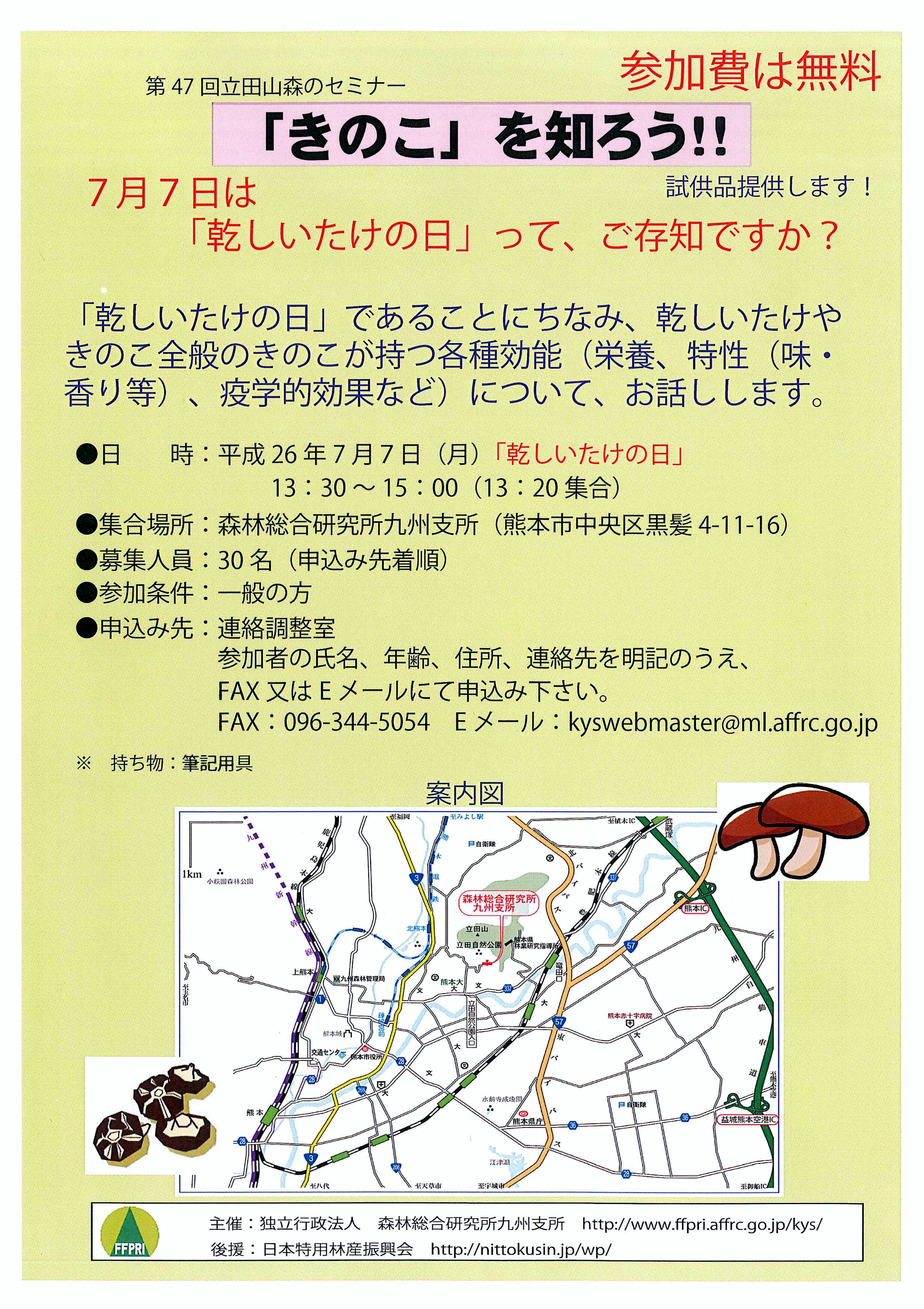 「きのこ」を知ろう!! 第47回立田山森のセミナー 2014年6月10日 最終更新日時 : 2014年6月10日 ohno 森林総合研究所九州支所のセミナーです。 7月7日「乾しいたけの日」にちなみ、乾しいたけやきのこ全般のきのこが持つ各種効能についてお話しします。 日時:平成26年7月7日(月) 乾しいたけの日 13:30~15:00 場所:森林総合研究所九州支所(熊本市) 主催:独立行政法人森林総合研究所九州支所後援:日本特用林産振興会 申込先:連絡調整室 FAX またはEメール 詳細はこちら↓