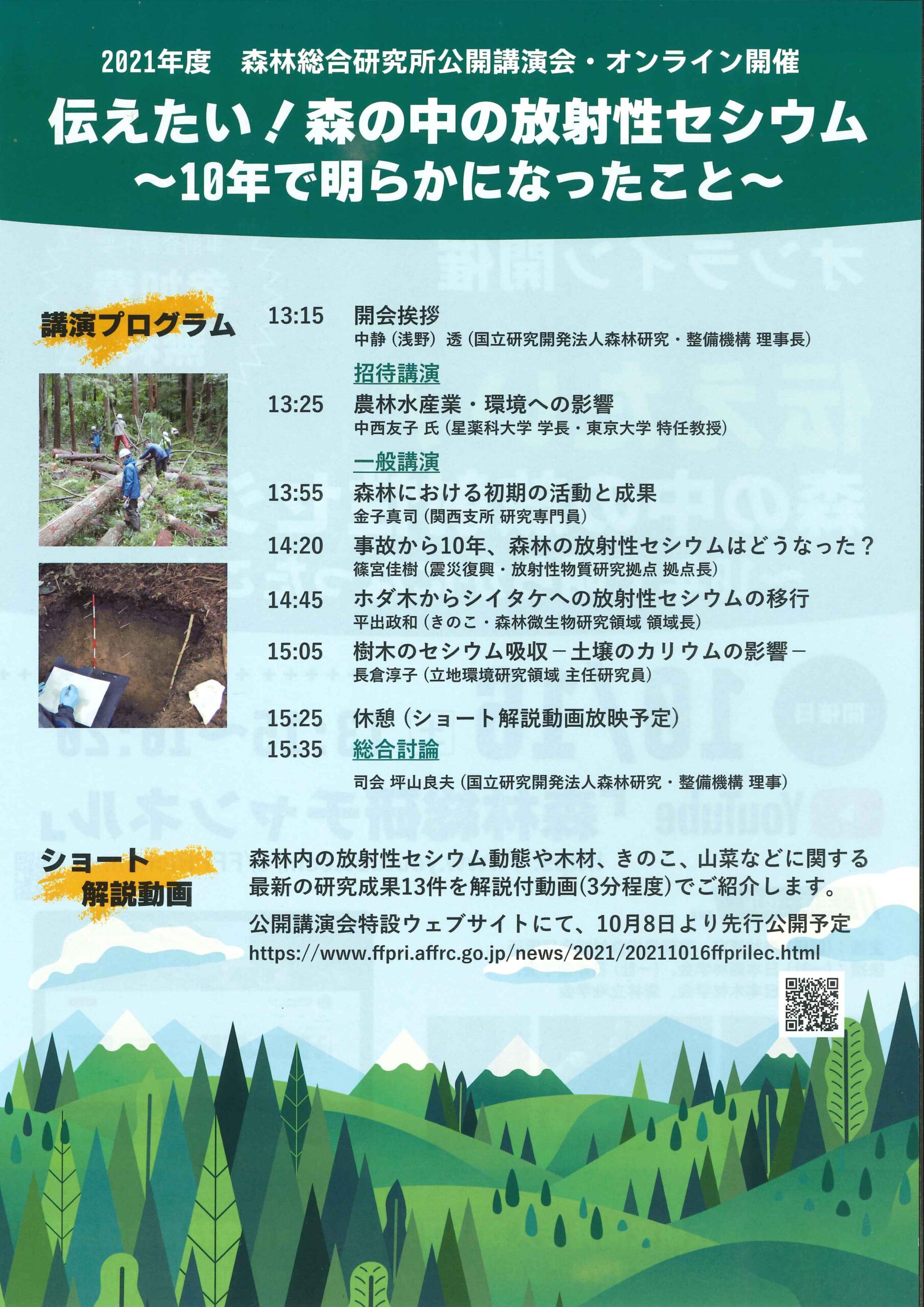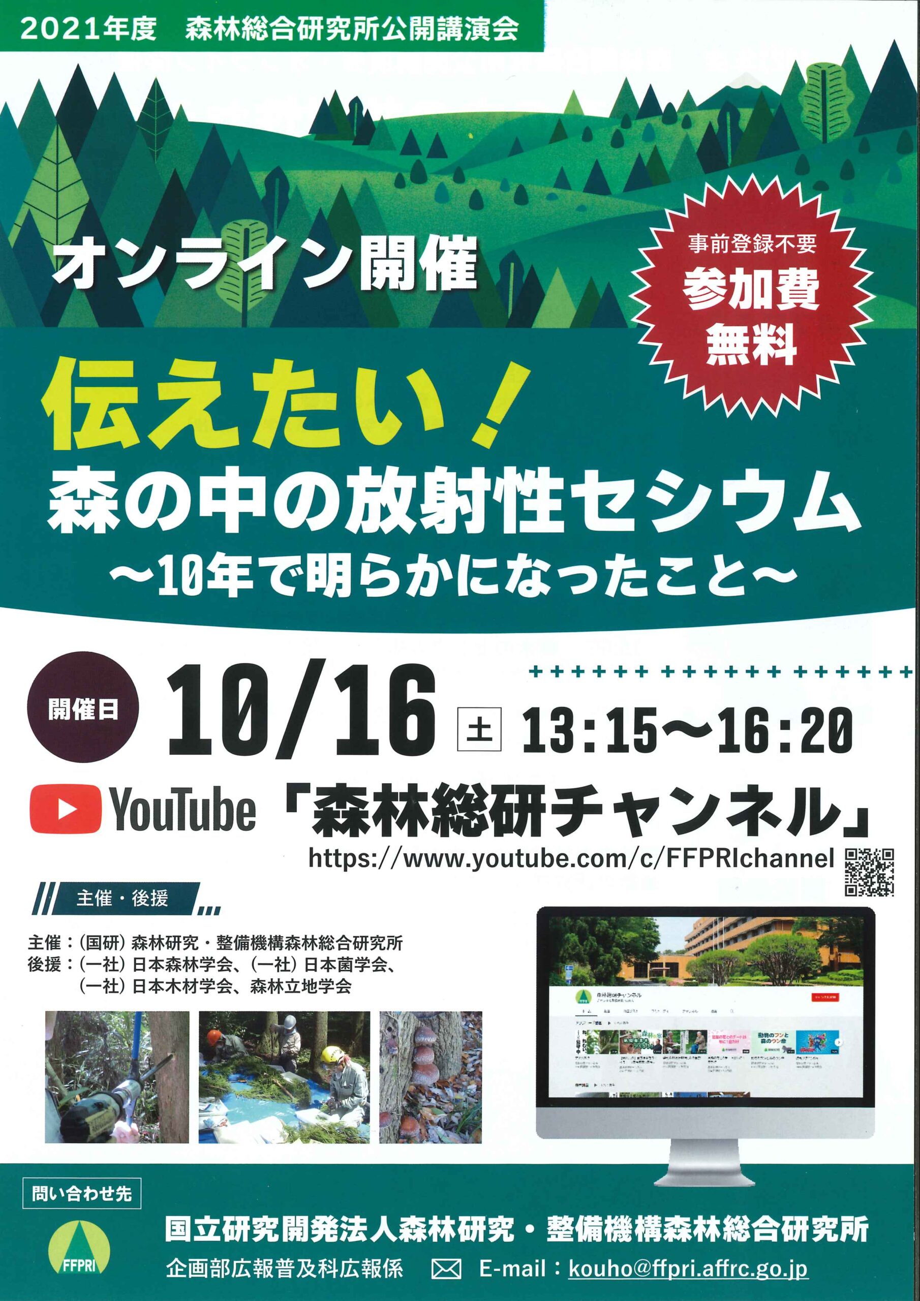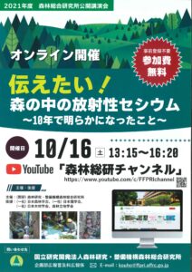 国立研究開発法人森林研究・整備機構 森林総合研究所は、2021年度公開講演会「伝えたい!森の中の放射性セシウム-10年で明らかになったこと-」をオンライン開催します。