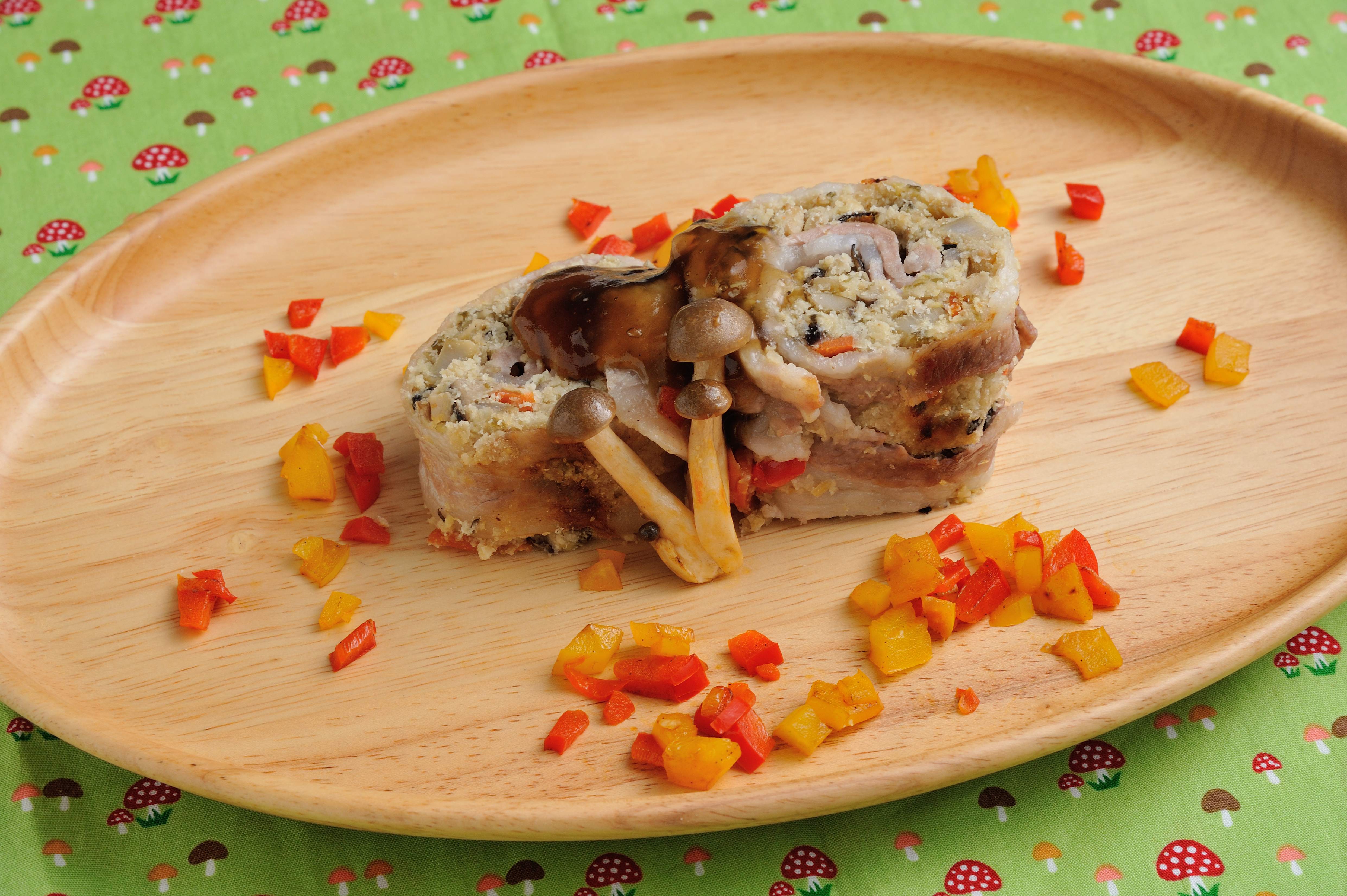⑨ オーブンで約10分焼いて、切り分け、炒めたパセリ、パプリカ、ぶなしめじを飾る。
