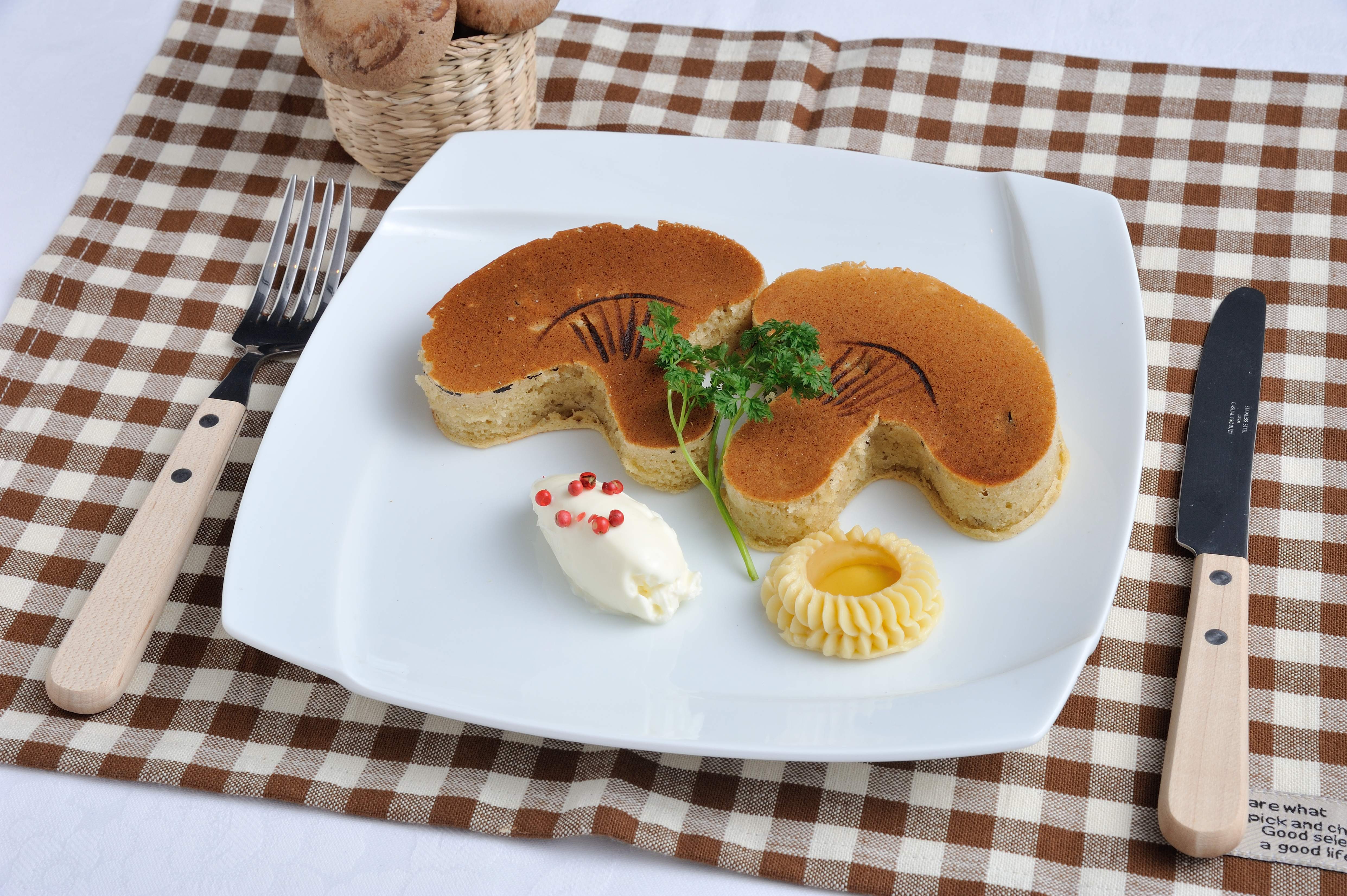 3.全卵、上白糖、干し椎茸戻し汁、牛乳、干し椎茸粉末、戻し干し椎茸、薄力粉、ベーキングパウダー、無塩バター、バニラオイルでパンケーキを仕込む。