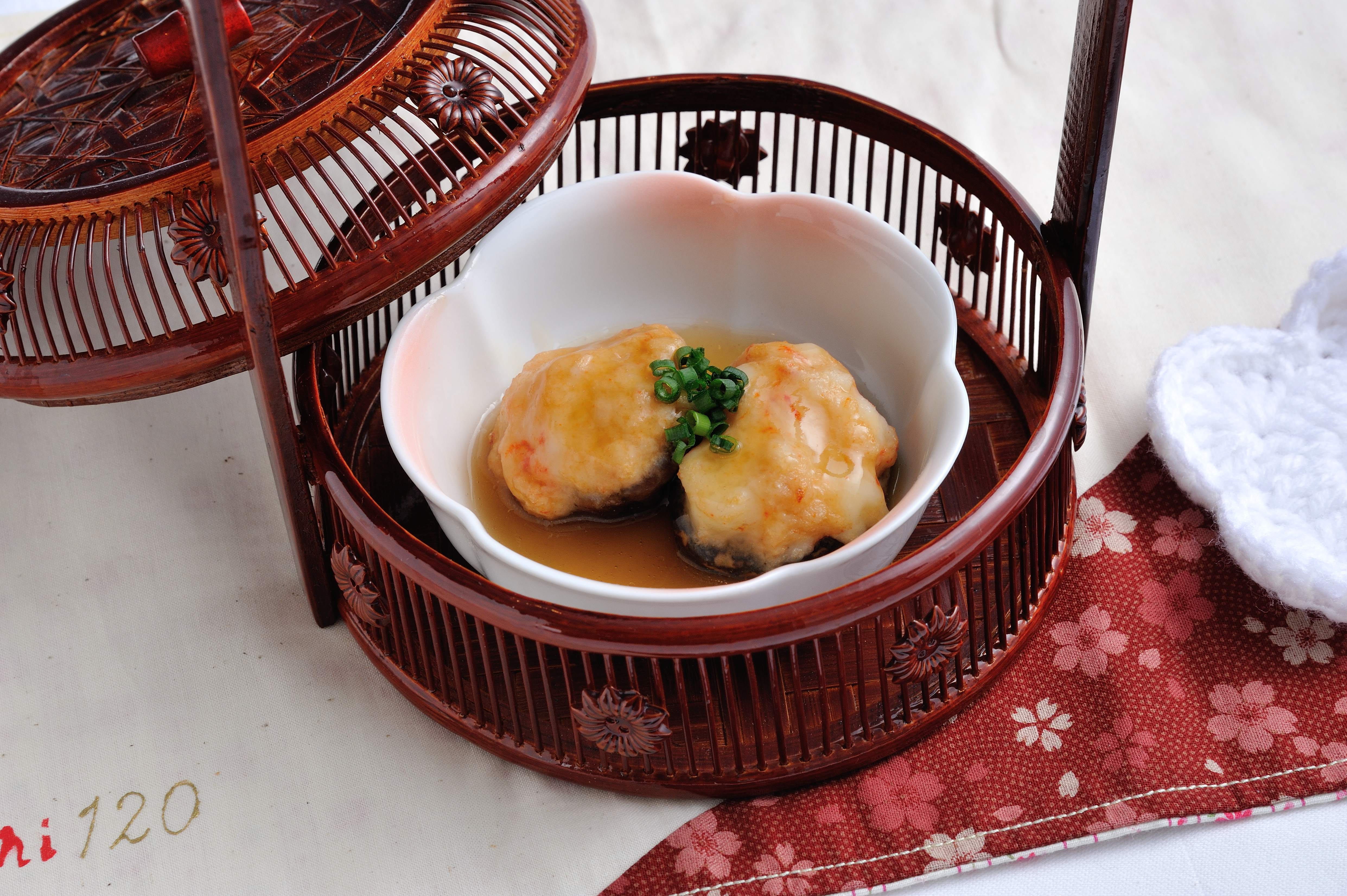 ⑤ 戻したしいたけに薄く片栗粉をまぶし,えびしんじょうのタネをスプーンに取り,しいたけに詰める。