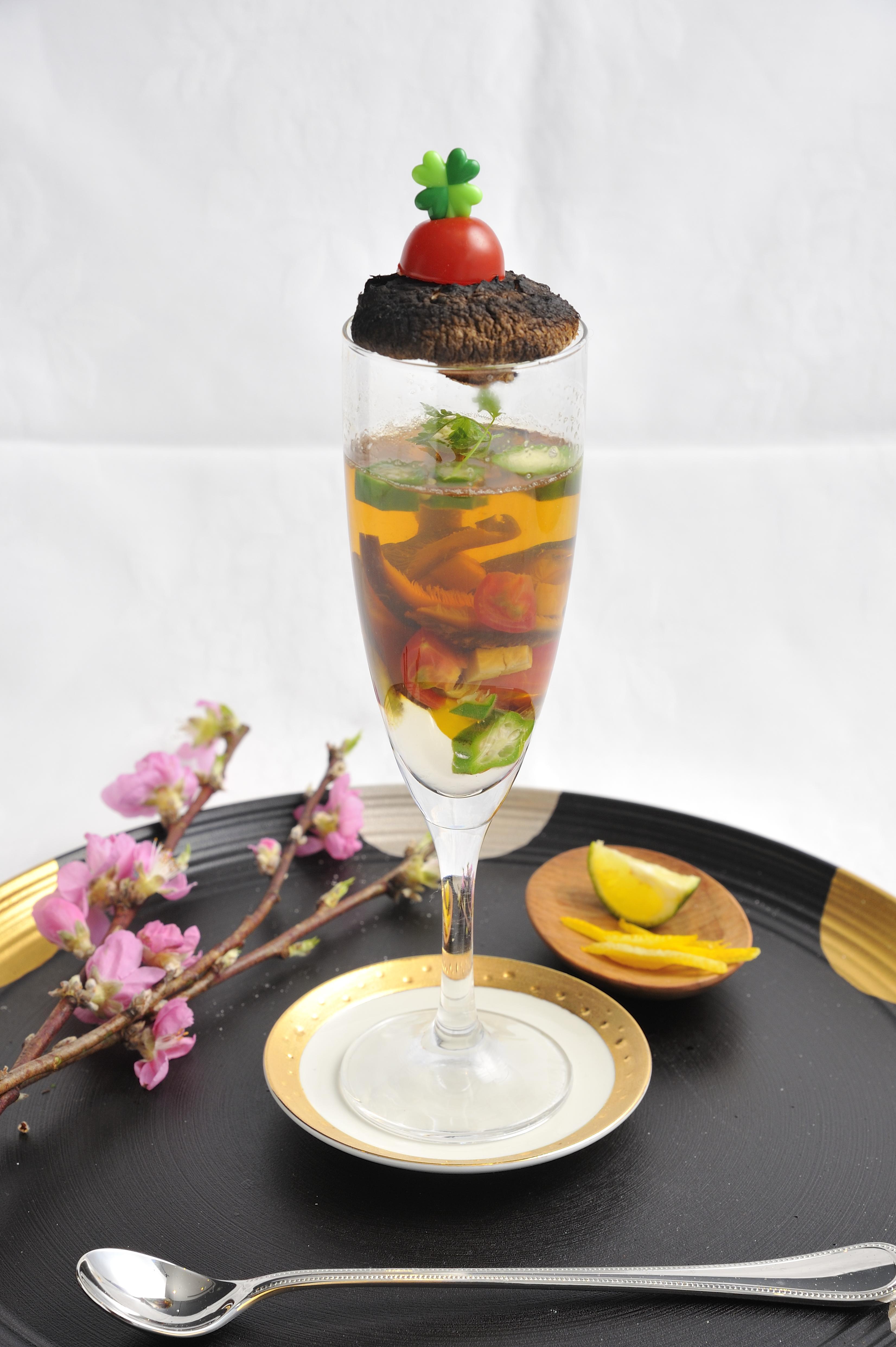 前菜〔きのこのおうち〕 2016年4月6日 最終更新日時 : 2016年4月6日 ohno 【栃木県】 吉澤 葵 使用しているきのこの種類:乾しいたけ 生しいたけ ひらたけ マッシュルーム <材料> 4人分 ・乾しいたけ(小) 2個・霜降りひらたけ 15g・ホワイトマッシュルーム 15g 〔下煮用〕・水 200cc・酒 小1 ☆・砂糖 小2 ☆・醤油 大2 ☆ ・オクラ 1本・ミニトマト 2個・パプリカ(黄)15g 〔ゼリー液〕・水400cc・白だし 大1.5 ★・塩 小1/2 ★・ゼラチン 7g ★ 〔飾り用〕・生しいたけ 4個・ミニトマト 2個・ピック 4本・チャービル 適量・ゆず、すだち 適量 材料費:約2,000円 <作り方> ① グラスを冷凍庫へ入れて冷やす。② ゼリー液をつくる。★の水400gに白だし大1.5、塩小1/2を入れて、溶かし、火を止めてゼラチンを少しずつ溶かす。→ボールを氷に入れて冷やす。③ きのこ類を切る。④ 冷やしたゼリー液をグラスに半分まぜ入れて、冷凍庫へ入れる。⑤ きのこ類を煮付ける。☆の酒小1、砂糖小2、醤油大2と乾しいたけをもどした液200gをまぜて10分→冷やす。⑥ オクラをさっとゆで、切る(星形に)⑦ グラスに材料(オクラ、パプリカ、きのこ)を入れて最後まで注いで冷やす。⑧ 生しいたけに塩をふって足をとり、焼く!!⑨ トマトを切る。⑩ かざりつけ <ポイント> ゼリー液をワイングラスに最初2cmくらい入れて、冷蔵庫で固めてから⑦をやると、出来上がりがより美しくなる。前菜にぴったりでとても美味しいです♪