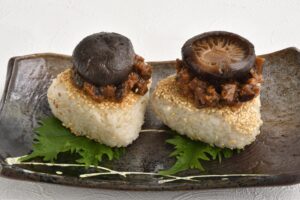⑫焼きおにぎりの上に、味噌ダレをぬり、しいたけのうま煮4枚分を1枚ずつ乗せる。