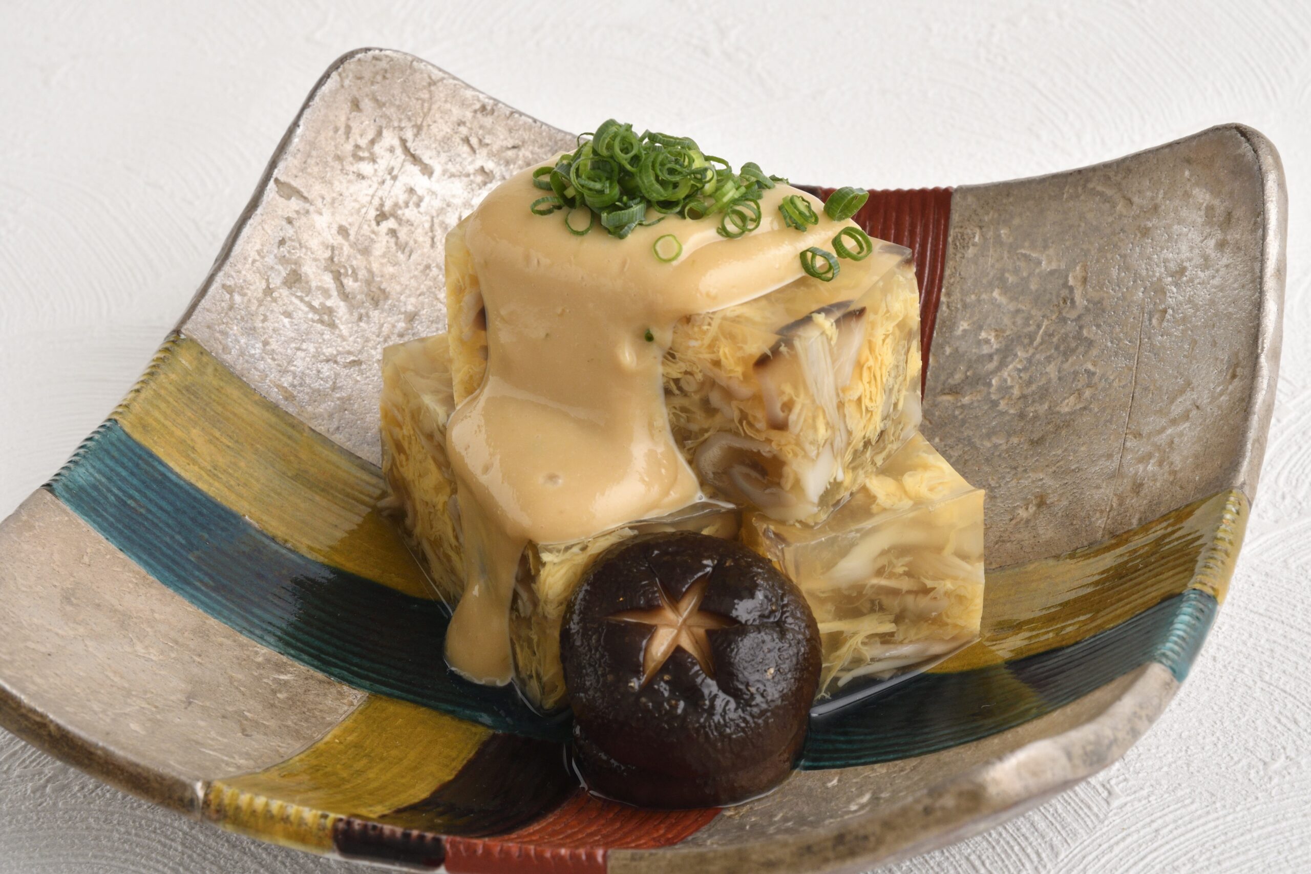 しいたけ、マイタケ、エノキを旨煮にし、かきたま汁をベースにした寒天地で寄せました。ソースはゴマダレで柚子の香りを効かせています。キノコの旬である秋の夕暮れを表現しました。