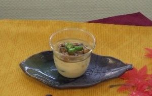 - 蒸し器から取り出し、なめこソースをかけ、塩ゆでしたおくらを輪切りにしたものを3つのせ完成。