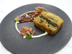 ・ミルフィーユ状になったじゃがいも・きのこ・ほうれん草・ベーコンのそれぞれの味や食感を別々に、又は一度に楽しめる一品です