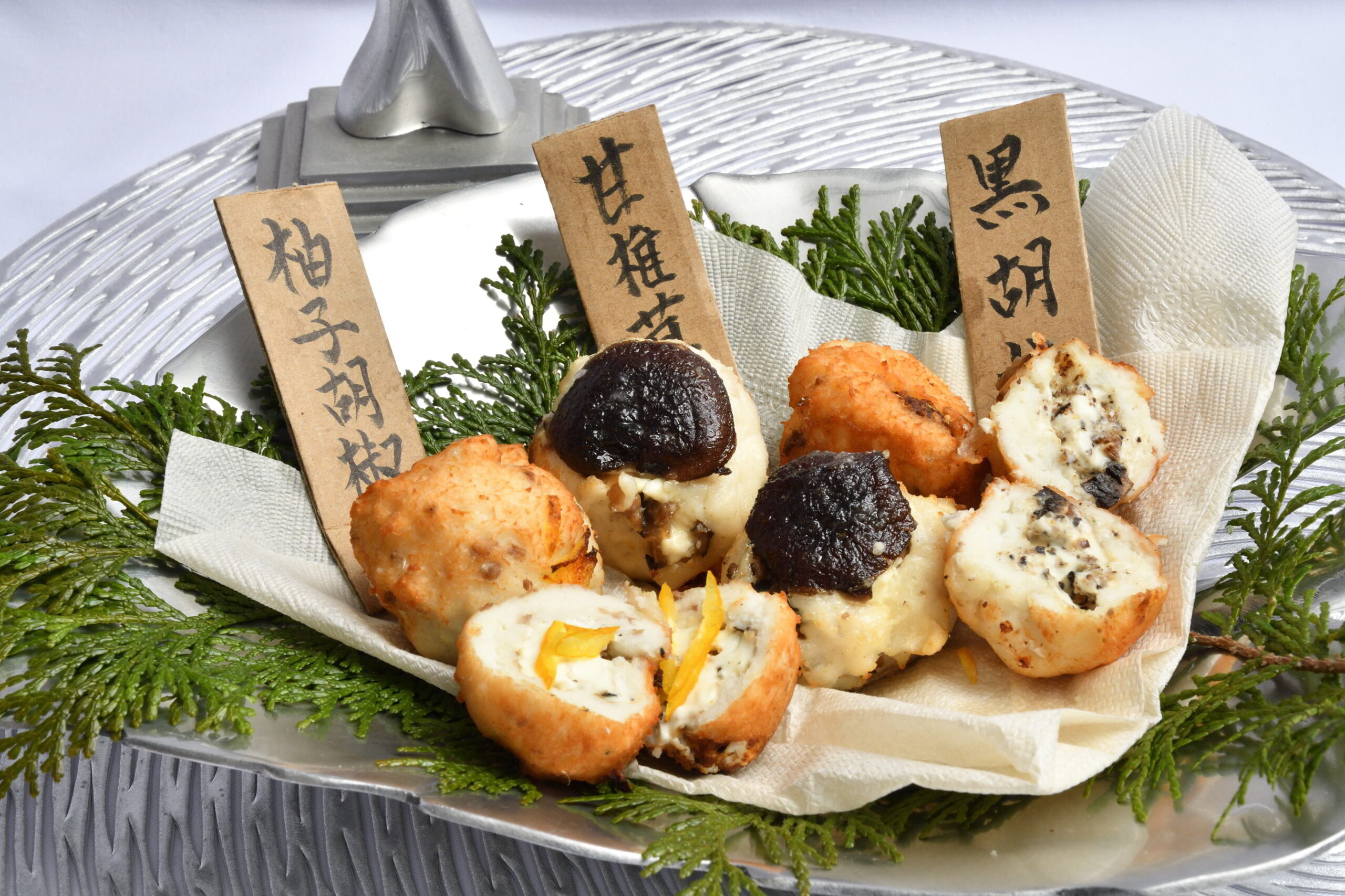 【味が違うチーズ3種づくり】 ⑥ クリームチーズに次のとおり材料を混ぜ合わせ、3種のチーズの餡をつくる A…③のしいたけ B…⑤の砕いたしいたけ、黒胡椒 C…⑤の砕いたしいたけ、柚子胡椒、柚子ノ皮 ⑦ クリームチーズの餡は、A・B・Cそれぞれ8等分しておく