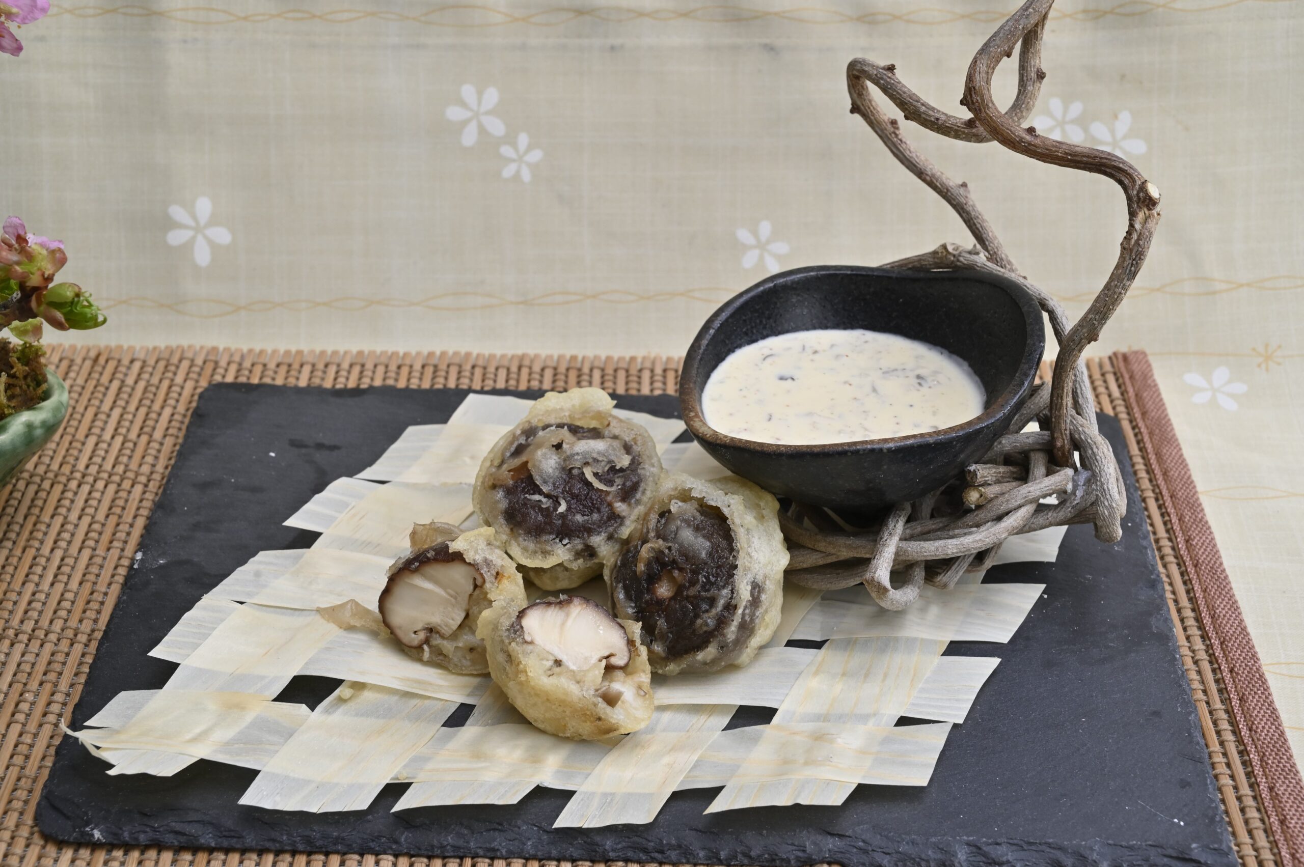 <ポイント> 1. 具にはんぺんととうふを使った所です。きのこの美味しさを前面に出す為、淡泊な物できのこのうまみを出しました。 2. 軸は詰め物に、戻し汁は具、衣、ソースに使い、捨てる所がほとんどなく、環境にもお財布にもやさしい料理です。 3. シイタケ、具、衣、ソースと歯触り、風味、コクが一体となってきのこの美味しさが最大限に味わえる逸品です。 4. 濃厚なソースで、ご飯にもビールにも良く合います。 |