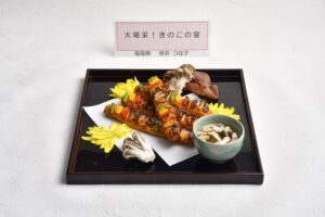 きのこの香り豊かなスティック状のもちです。1本のスティックで、それぞれのきのこの味、舌触 り、彩が楽しめます。出来上がったときに拍手で喜んでもらえたので「大喝采!きのこの宴」とネ ーミングしました。不眠やイライラに効果のある手作りしいたけ酒を添えました。