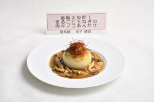 乾しいたけの戻し汁を活用し、きのこの風味を大切にしました。また、全体的に歯ごたえの良い食材を使いました。食感が良いだけでなく、きのこと玉ねぎ、肉の相性も良く、あんかけにもきのこをふんだんに使用しました。乾しいたけの香りが感じられる優しい味付けに仕上げました